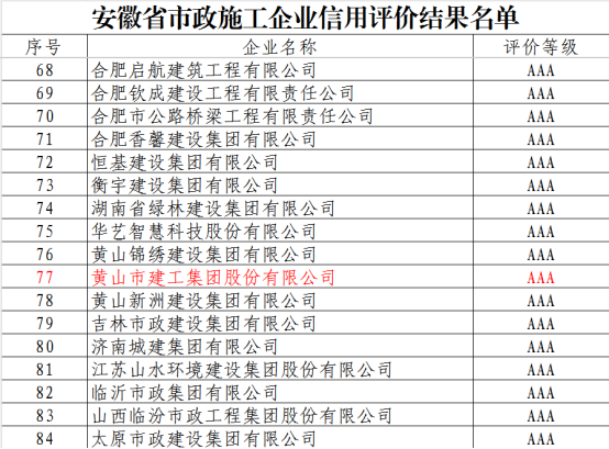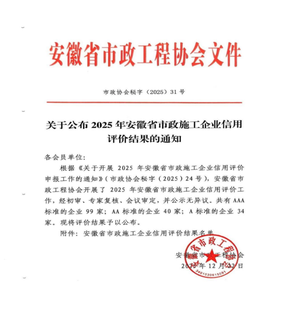 近日,安徽省市政工程協(xié)會正式發(fā)布《關于公布2025年安徽省市政施工企業(yè)信用評價結果的通知》。黃山市建工集團憑借卓越的綜合實力、規(guī)范的市場行為、優(yōu)良的工程品質及堅實的信用體系建設,成功獲評最高信用等級——AAA級。標志著集團在誠信經(jīng)營、履約能力與社會責任履行方面獲得了行業(yè)主管部門與協(xié)會的高度認可,是企業(yè)信用建設領域的又一重要里程碑。